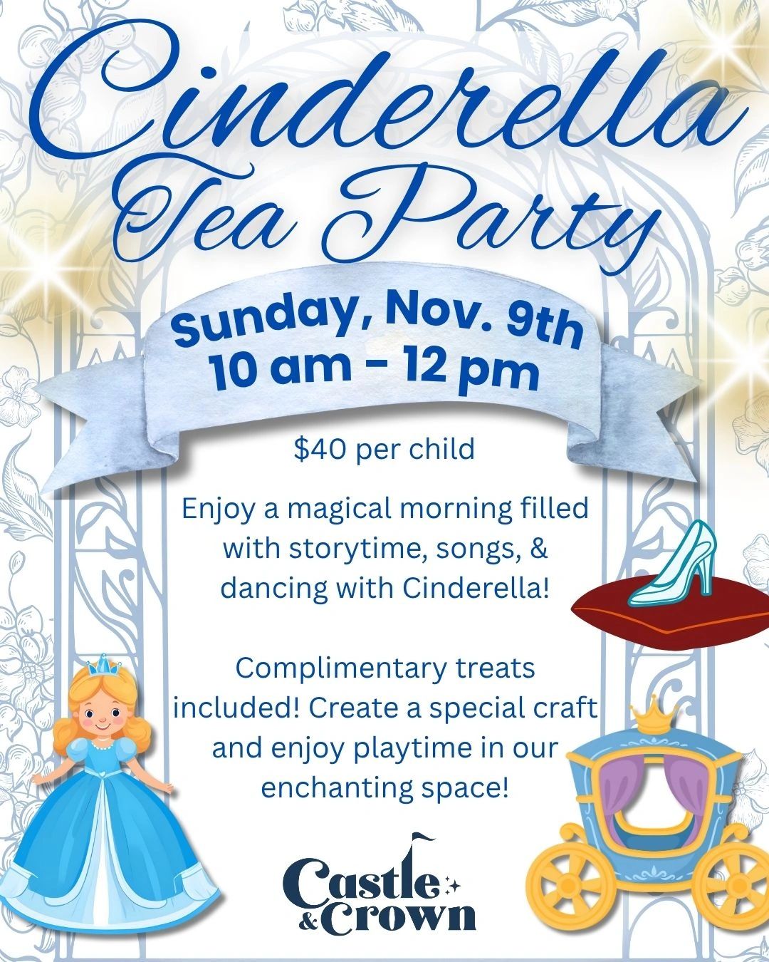 Enjoy a magical morning filled with storytime, songs, & dancing with Cinderella! Complimentary treats included! Create a special craft and enjoy playtime in our enchanting space!