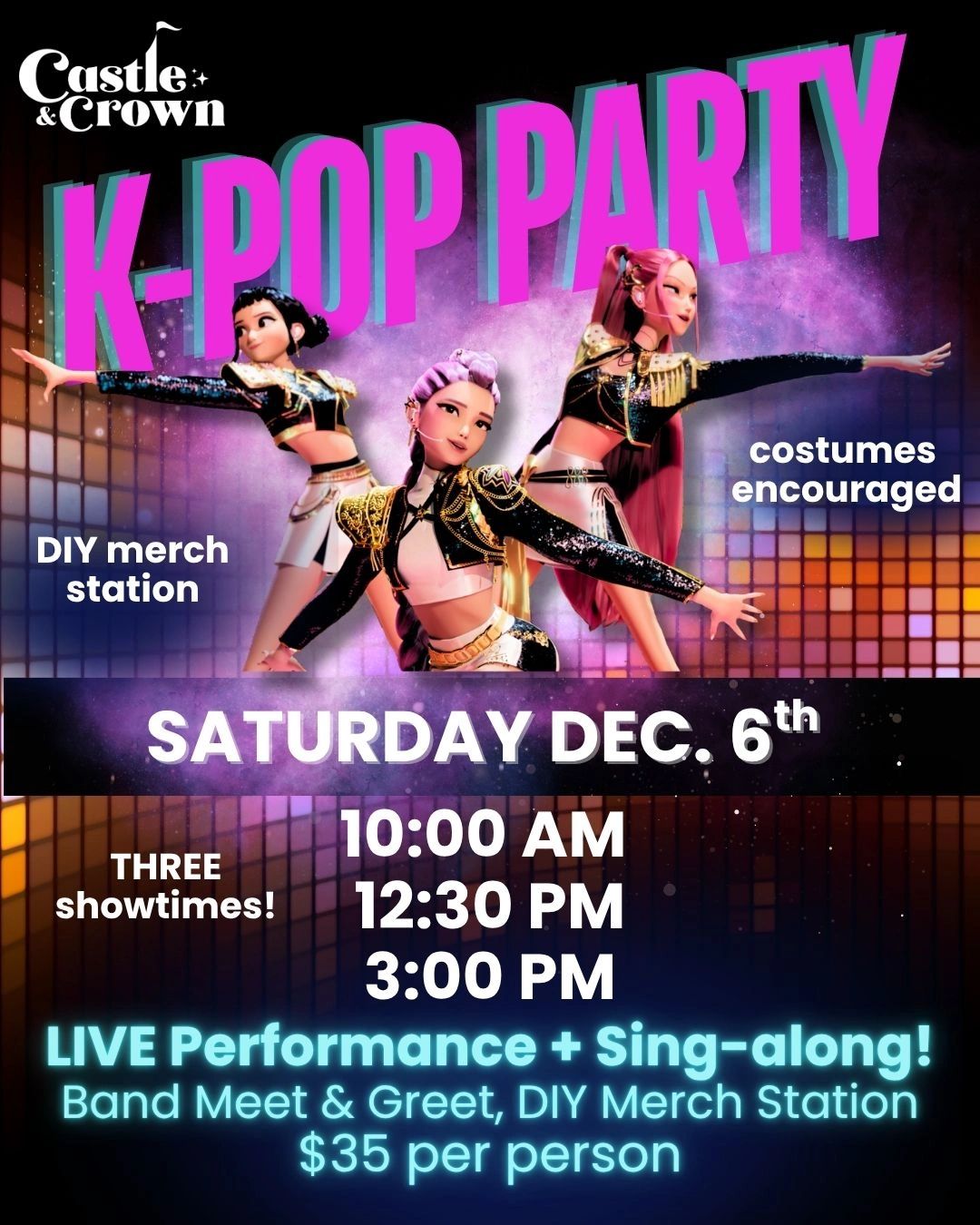 Enjoy a live tribute performance and sing-along with our “Huntrix” performers! Meet the "band" and create your own DIY merch! Costumes encouraged!