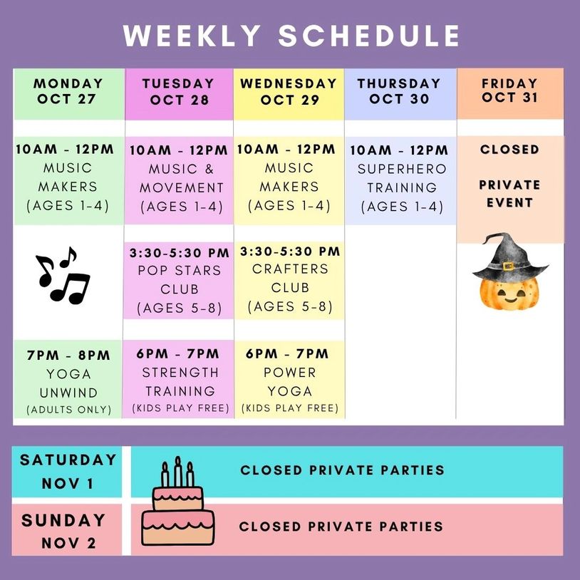 We offer enrichment play groups for toddlers: Music & Movement, Music Makers, & Superhero Training! And interest clubs for kids: Pop Stars Club & Crafters Club!
