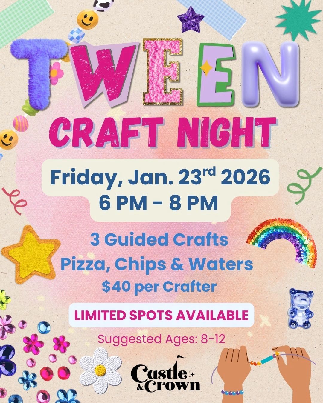 Calling all creative tweens! Join us for a fun-filled night of hands-on crafting where each crafter will create 3 awesome projects to take home. Enjoy complimentary pizza, chips, and water while you craft and hang out with friends in our magical space.